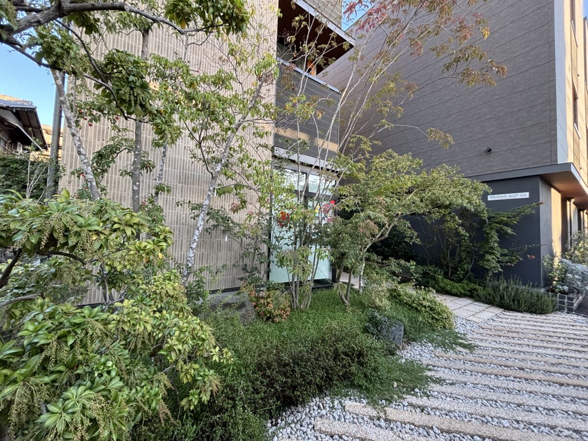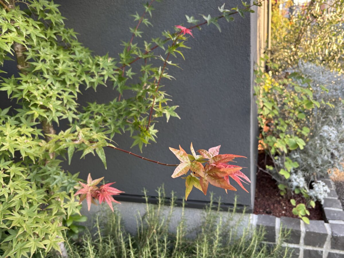 エントランスへ続く植栽の中にあるオオモミジは、先端の葉がうっすらと赤みを帯びはじめていました。まだ全体は青々としていますが、これから少しずつ紅葉していくのが楽しみです。