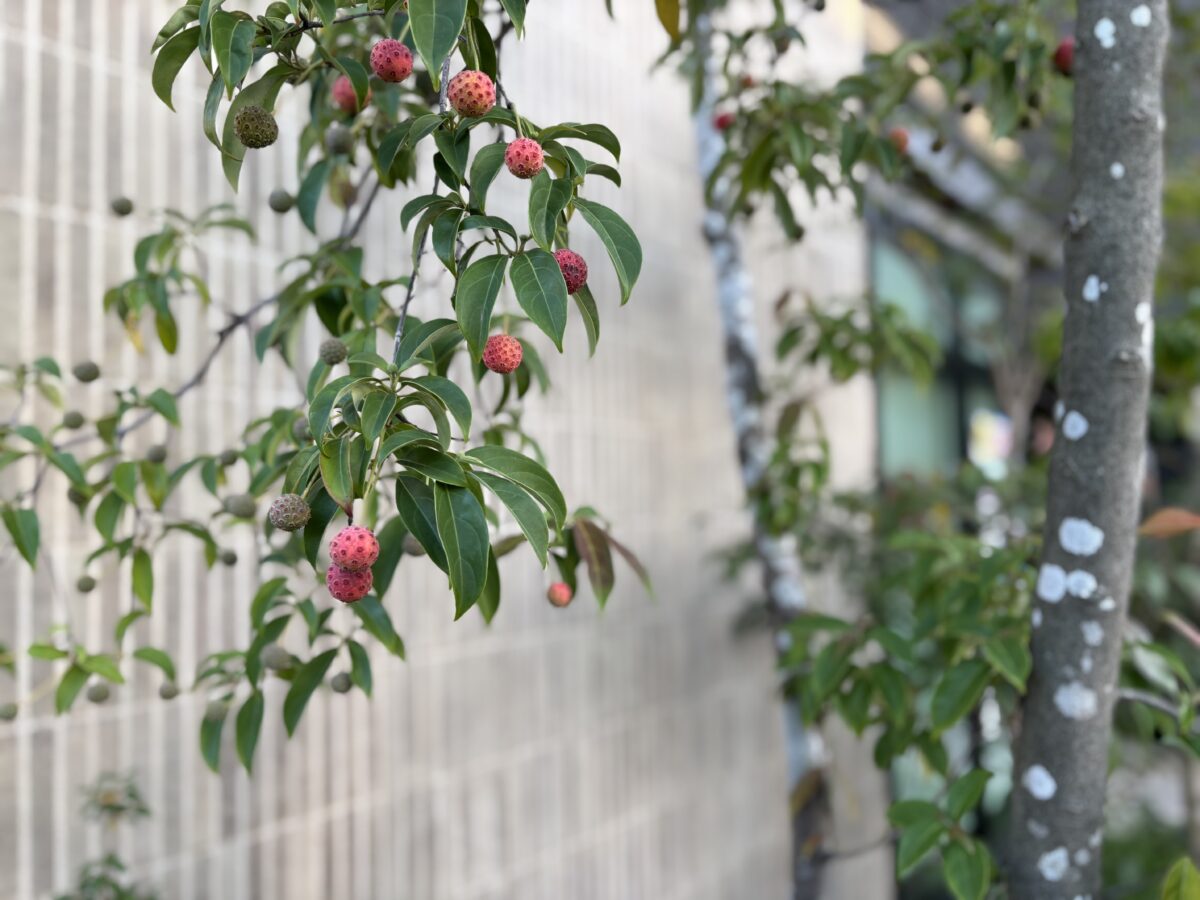 また、バス停側に植えてあるヤマボウシの実も、ピンク色に色づいてきました。