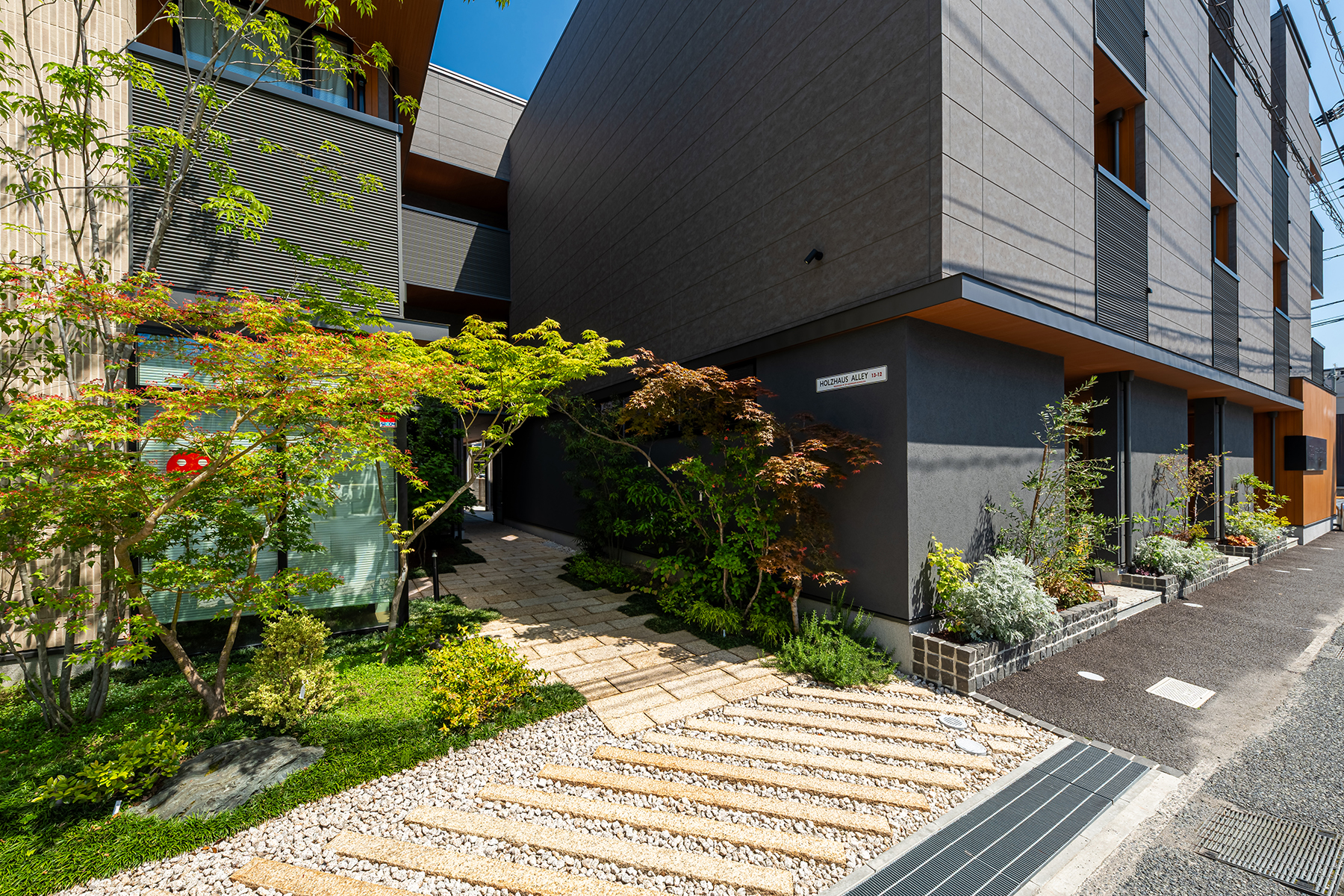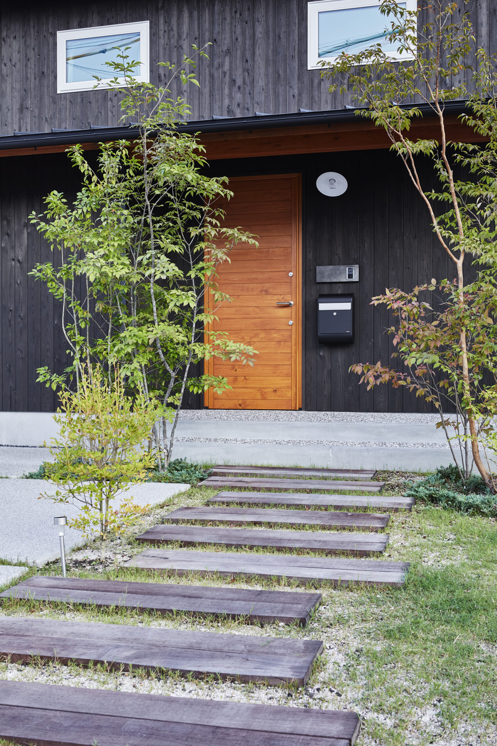 植栽の緑が鮮やかで、玄関へ続くアプローチ全体が明るく開かれた雰囲気に。