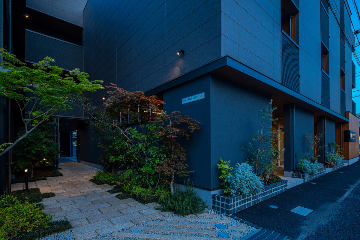 植栽が豊かなアプローチでは、夜の光が葉一枚一枚に表情をつくり、昼よりもしっとりと落ち着いた雰囲気に。通りから建物を見たときの安心感や入りやすさにもつながり、夜の見え方を整えるだけで建物全体の印象がぐっと洗練されます。