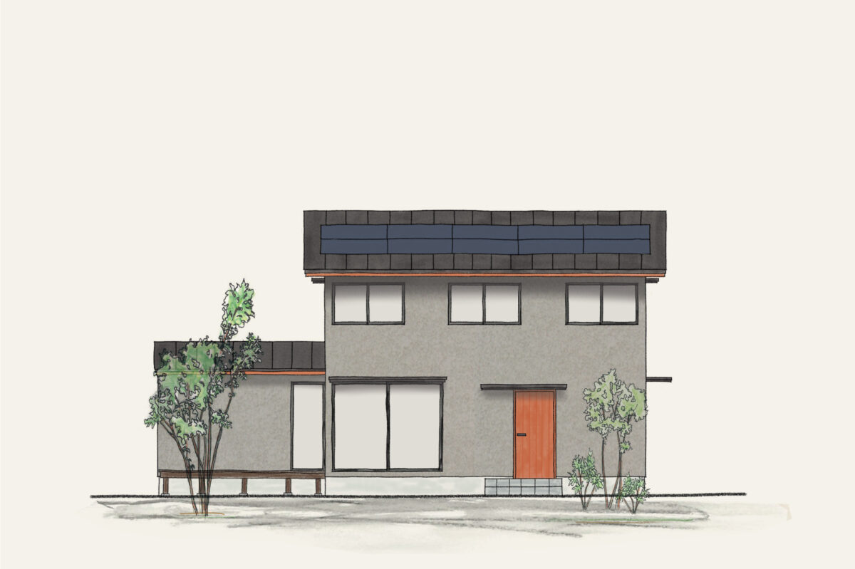 外壁にはジョリパットのミーティア仕上げを採用。時間帯ごとに異なるニュアンスを見せる、柔らかな質感が特徴です。玄関ドアと木部は、やさしい橙色を帯びたラーチカラーを合わせて、外観にアクセントをプラスしています。