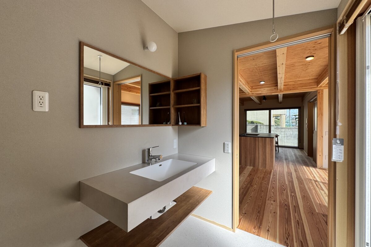 洗面化粧台はお手入れのしやすい一体型カウンター。