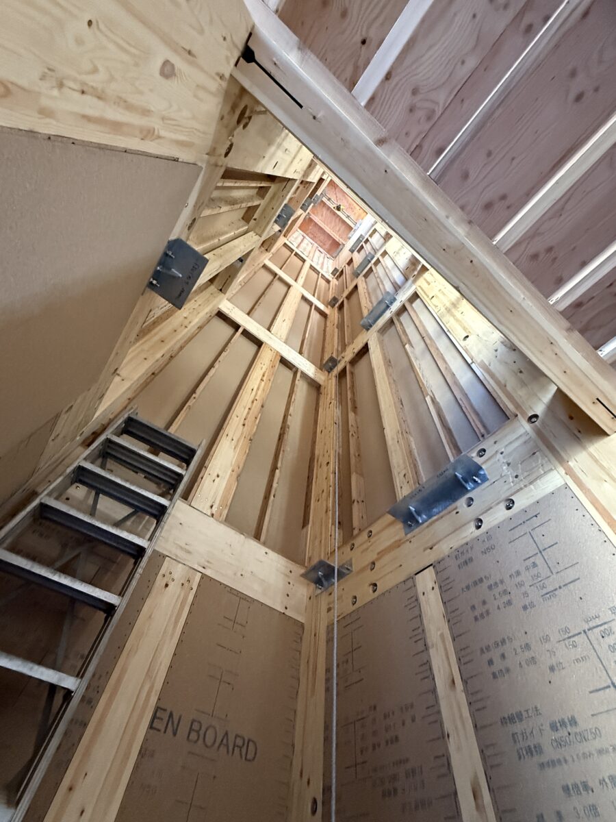 エレベーターシャフトも、通常でしたら鉄骨のやぐらを組んでエレベーターを設置するそうですが、SE構法とエレベーターメーカーとの協業で、安全に構造計算された木造の躯体に直接アングルを取り付けてエレベーターの設置が可能になっているとのことでした。