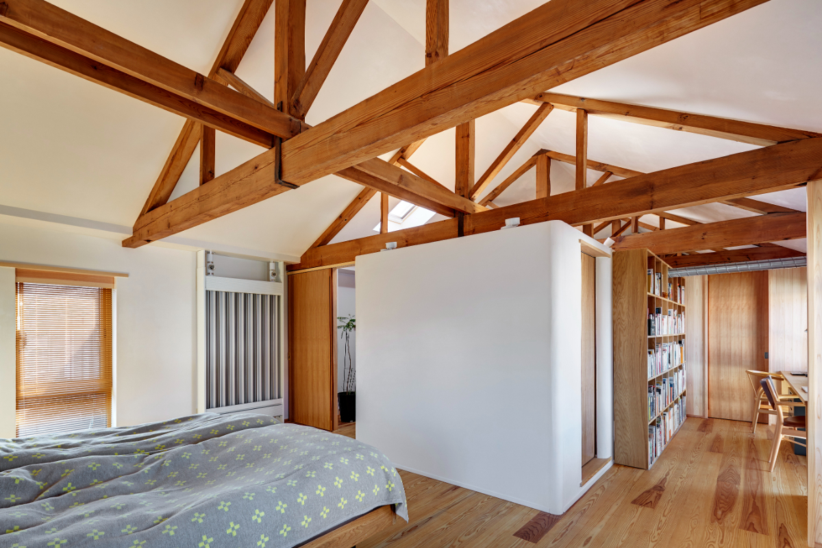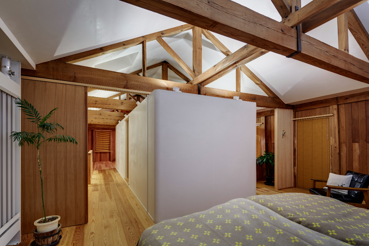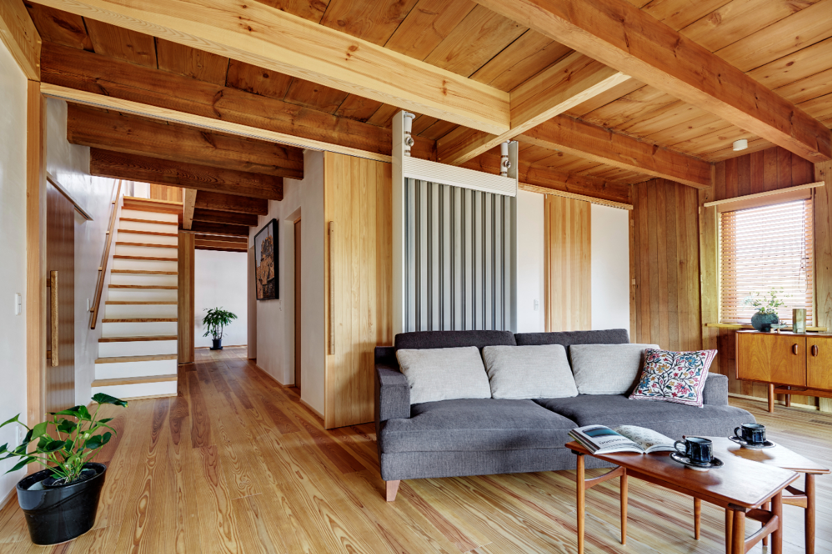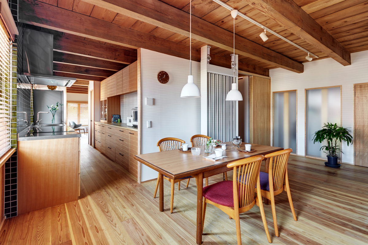 暮らしはじめて10年を迎えたまゆの蔵は、年月を経て木部が味わいのある飴色へと変わっています。蔵の面影を残しつつ、新しく継ぎ足した柱や梁の色も徐々に馴染んでいき、空間全体に温かみと安心感を感じられる住まいです。