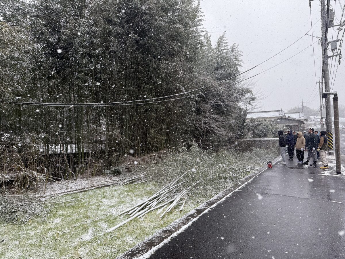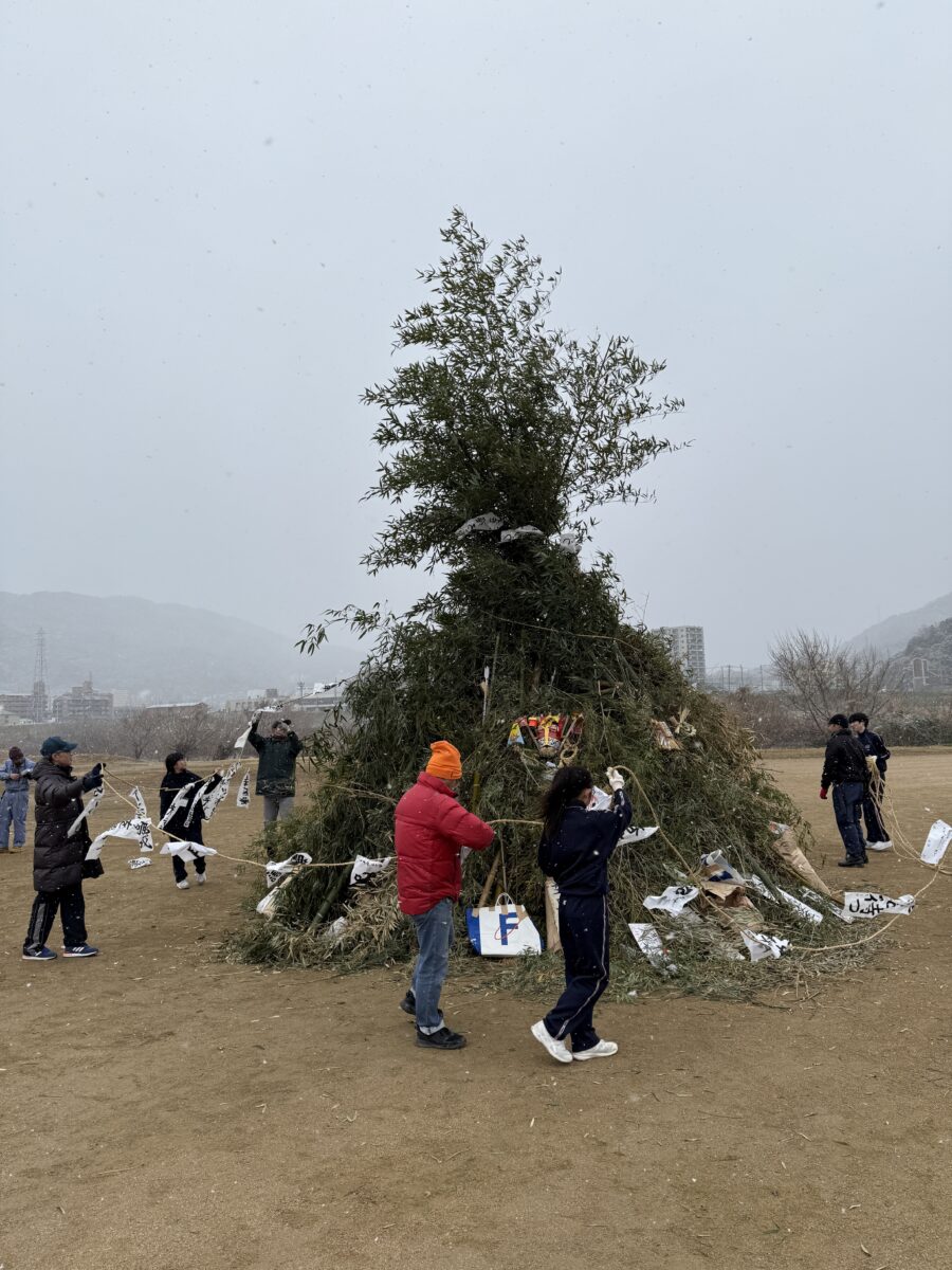 とんどの係として、早朝から竹取りに参加し、運搬した竹やあらかじめ準備された木材や藁などを使ってやぐらを組み立てるまでが午前中の作業でした。