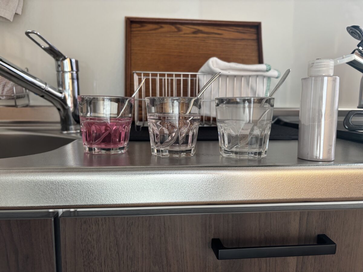 利用頻度の高い事務所の浄水器を通した水は、わずかに赤く反応しました。一方、利用頻度の低い櫟の浄水器では、ほとんど変化が見られませんでした。