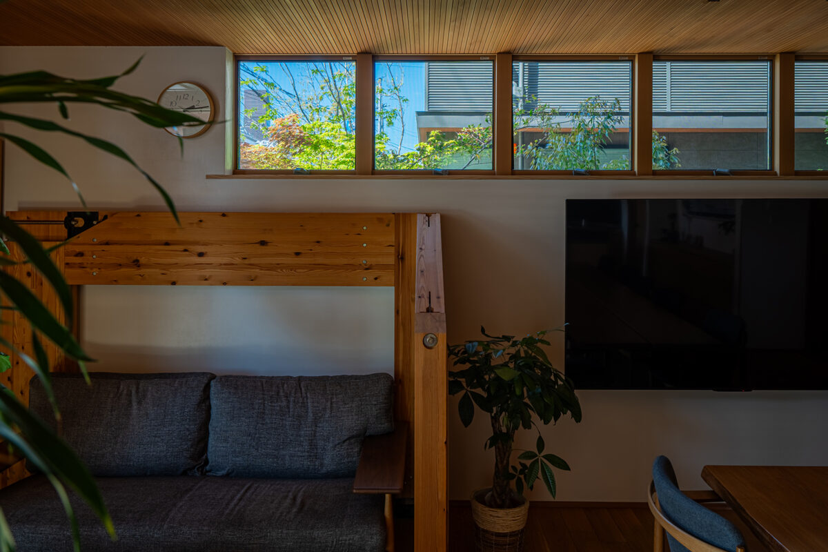 Gallery檪は植栽側に高窓を設けてあるので、風に揺れる葉が視界に入ります。気持ちよさそうに揺れる葉を見ていると、とても癒されます。