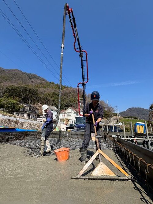 打設後は素早く均し作業に入り、表面の仕上がりや高さの精度、
