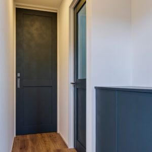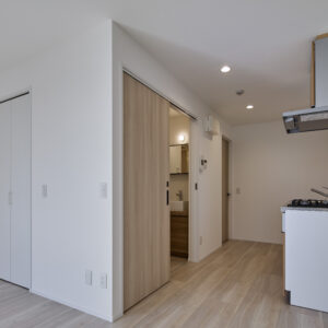 住戸は26~51㎡で、単身者やカップルを想定した間取り。中央に水回りを集約し、回遊性を持たせることで暮らしやすさを高めています。東西の個室でプライバシーを確保しつつ、家事動線にも配慮したプランです。3階の一部住戸には吹き抜けを設け、明るく開放的な空間をつくりました。設備は高効率給湯器や高性能サッシを採用し、居住時のエネルギー負担を軽減。上下階の遮音性にも配慮し、乾式二重床や石膏ボード二重貼りなど、注文住宅で培った技術を幅広く活かしています。