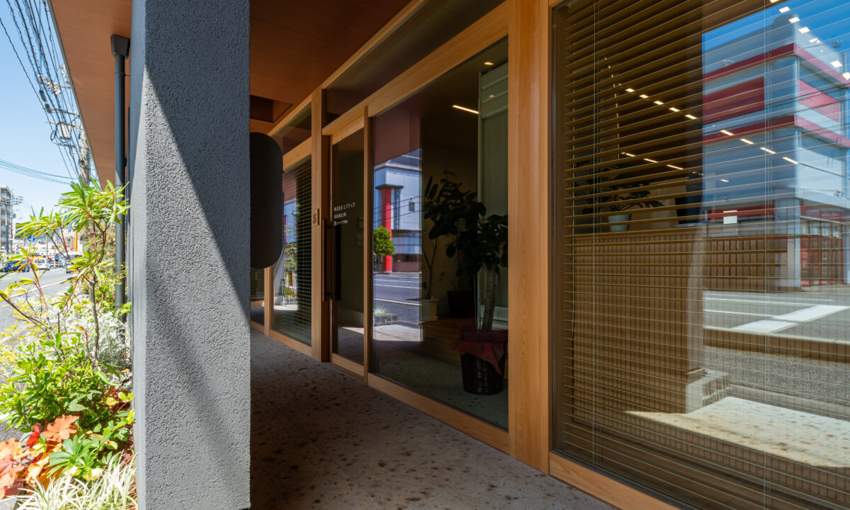 外観は1階テナント部分と2・3階の住戸部分で表情を切り替え、庇を挟んで水平ラインを強調。1階は左官壁や板貼りで落ち着いた素材感を、上階はシンプルで整ったファサードとし、周囲の街並みに調和するデザインとしています。また、敷地の特徴を活かした計画として、バス停前は建物をセットバックさせてポケットパークのような広場を設えています。30種類以上の植栽を配し、四季の変化を楽しめる外構としました。住まう方はもちろん、バス利用者や道行く人にも開かれた場となり、地域にやさしく寄り添う賃貸住宅を目指しています。