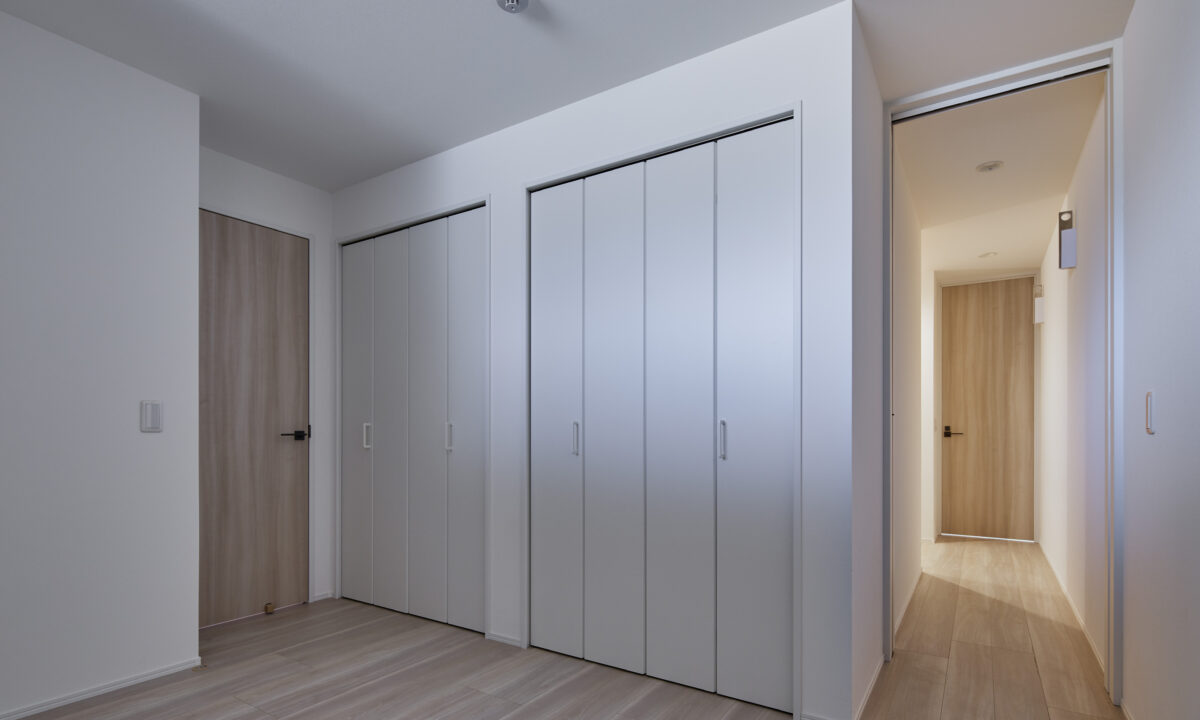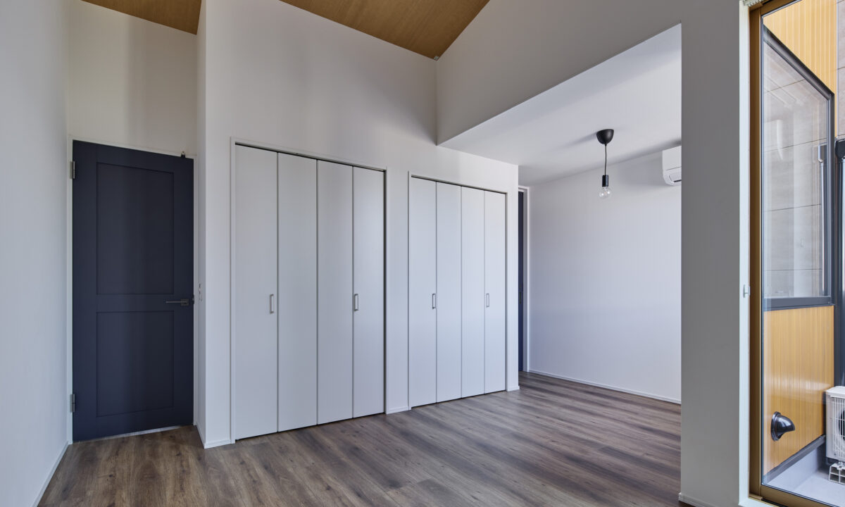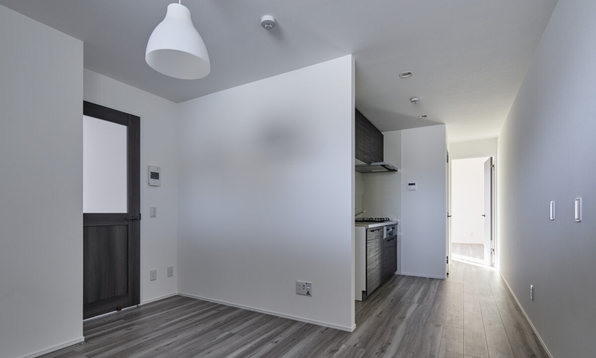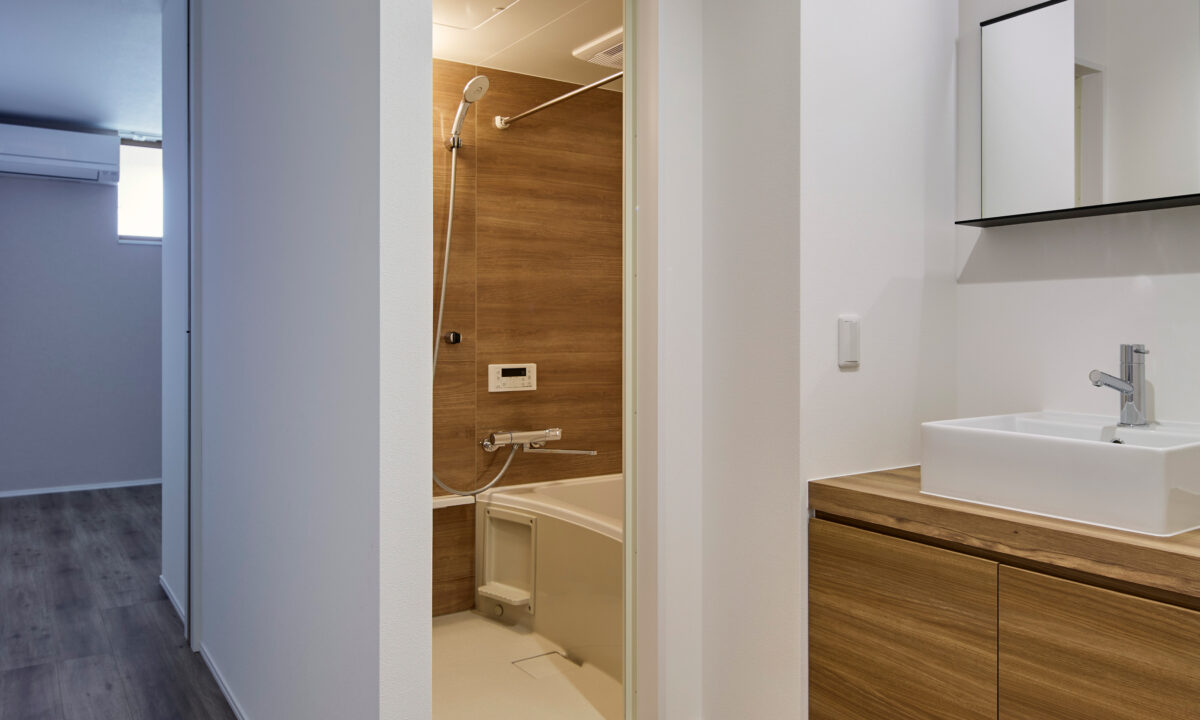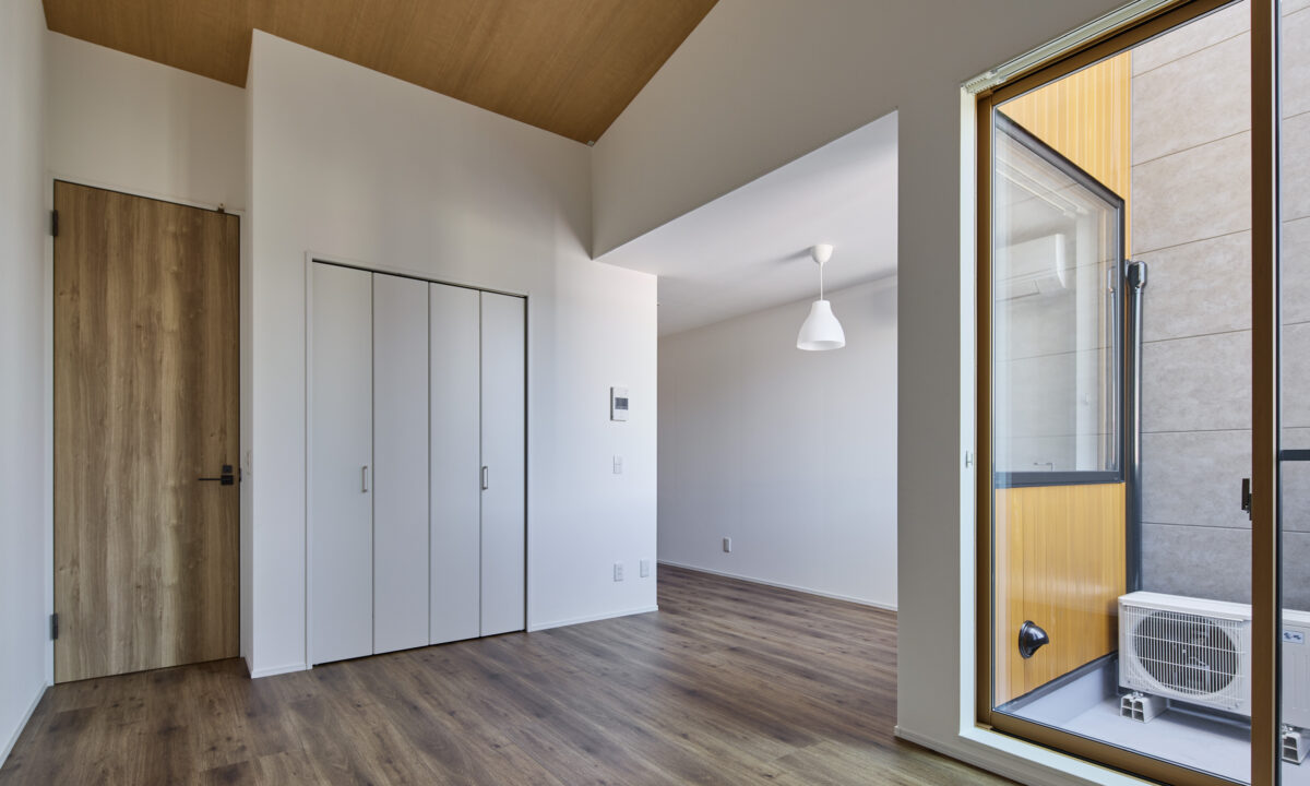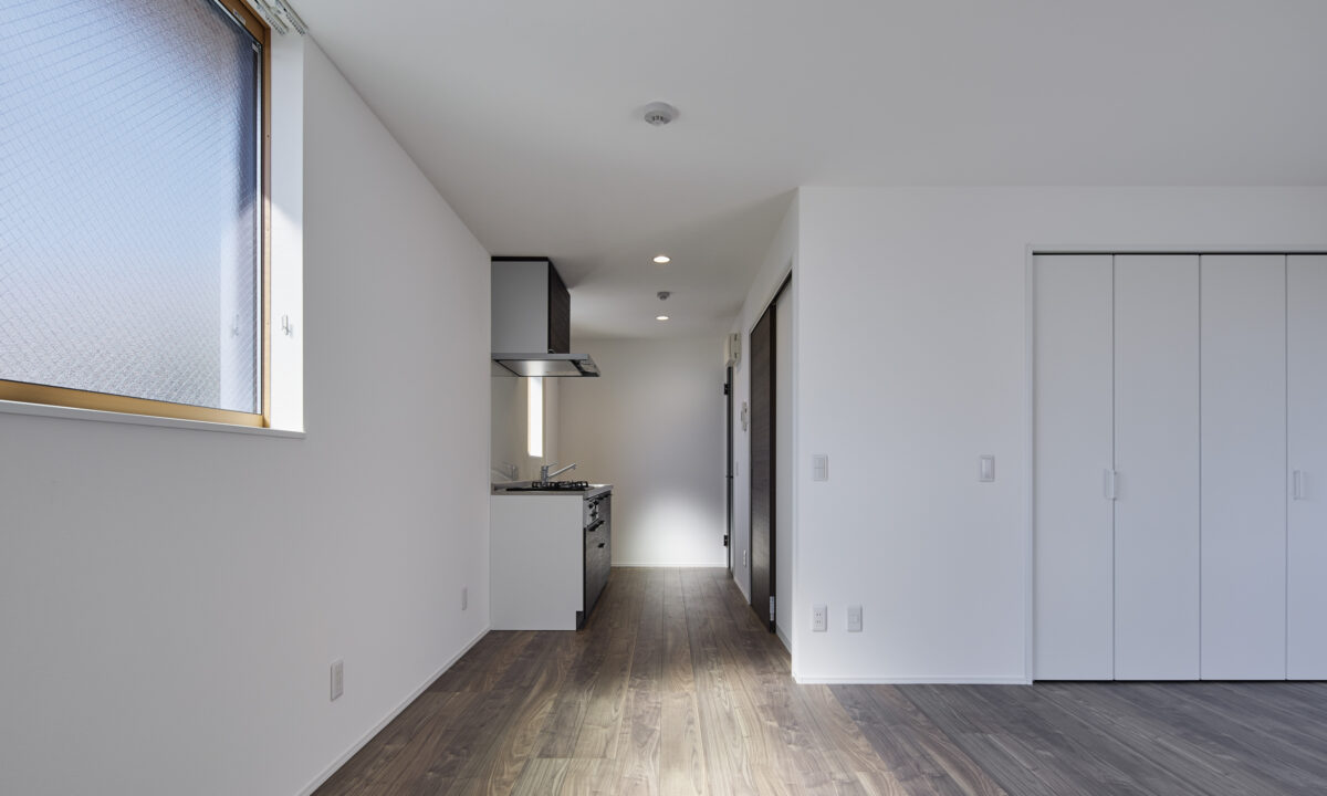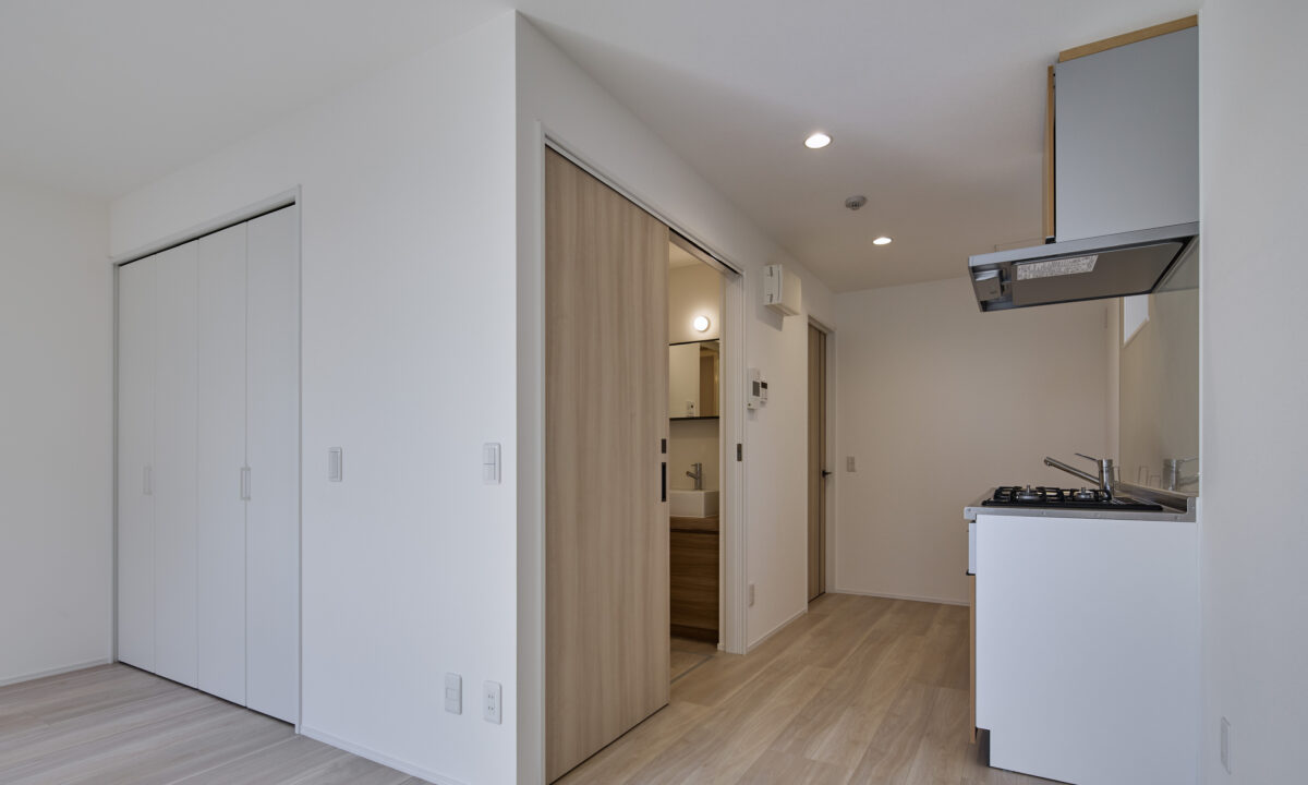 住戸は26~51㎡で、単身者やカップルを想定した間取り。中央に水回りを集約し、回遊性を持たせることで暮らしやすさを高めています。東西の個室でプライバシーを確保しつつ、家事動線にも配慮したプランです。3階の一部住戸には吹き抜けを設け、明るく開放的な空間をつくりました。設備は高効率給湯器や高性能サッシを採用し、居住時のエネルギー負担を軽減。上下階の遮音性にも配慮し、乾式二重床や石膏ボード二重貼りなど、注文住宅で培った技術を幅広く活かしています。
